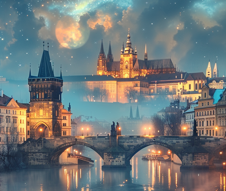 Karlův most, postavený v 14. století, spojuje Staré Město s Malou Stranou a je jedním z nejvýznamnějších symbolů Prahy. Pod zářícím měsícem a osvětlením lamp na mostě se staré kameny zdají ožívati. Tato historická památka nese příběhy generací a od jeho vzniku až dodnes, mnoho umělců a romantiků zde zanechalo stopy.